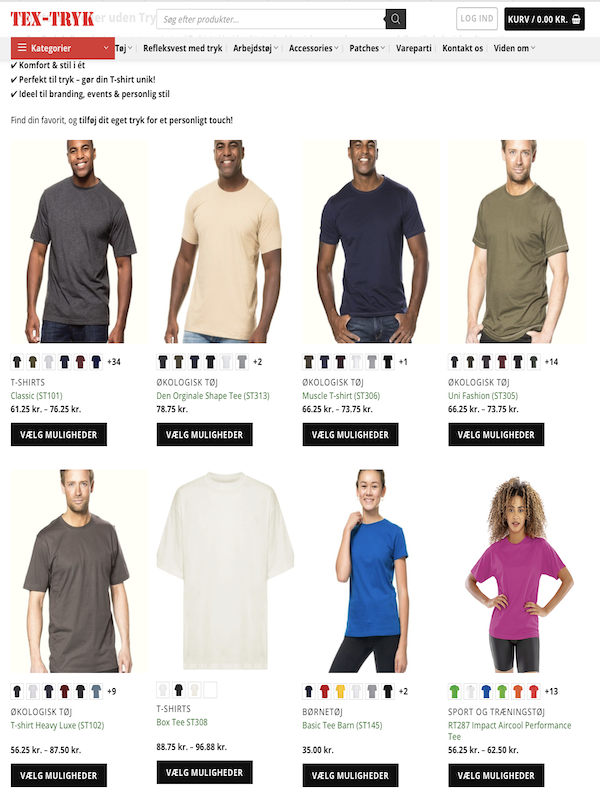 Tex-Tryk er en dansk virksomhed med speciale i tryk på tøj og tekstiler til både private og erhverv. Siden 1976 har vi leveret kvalitetsløsninger, der kombinerer moderne trykteknologi med mange års erfaring. Vi tilbyder et bredt udvalg af produkter, herunder T-shirts, poloshirts, sweatshirts, arbejdstøj, sportstøj, muleposer, forklæder og andre tekstilprodukter – alle med mulighed for logo, tekst, grafik eller broderi.
